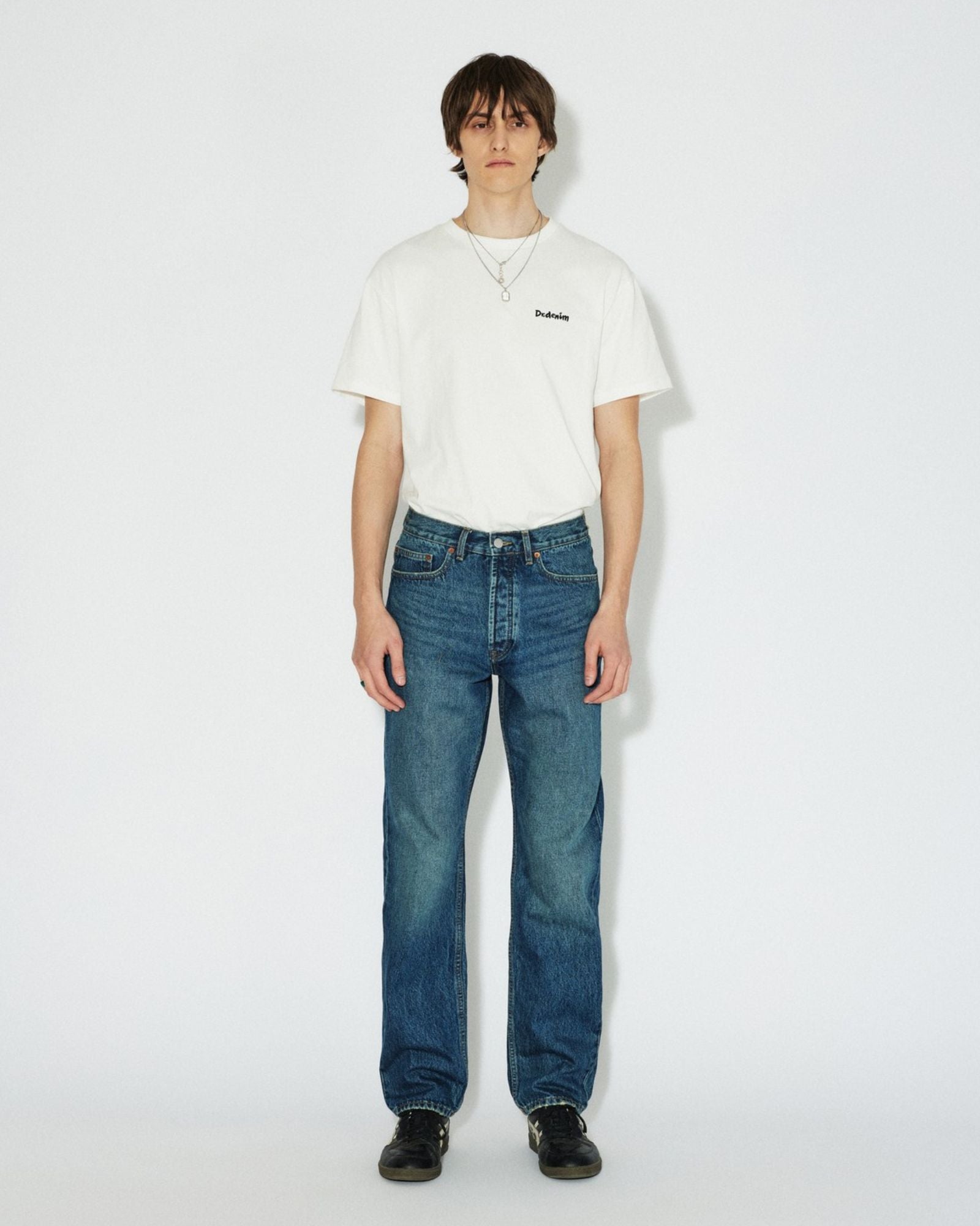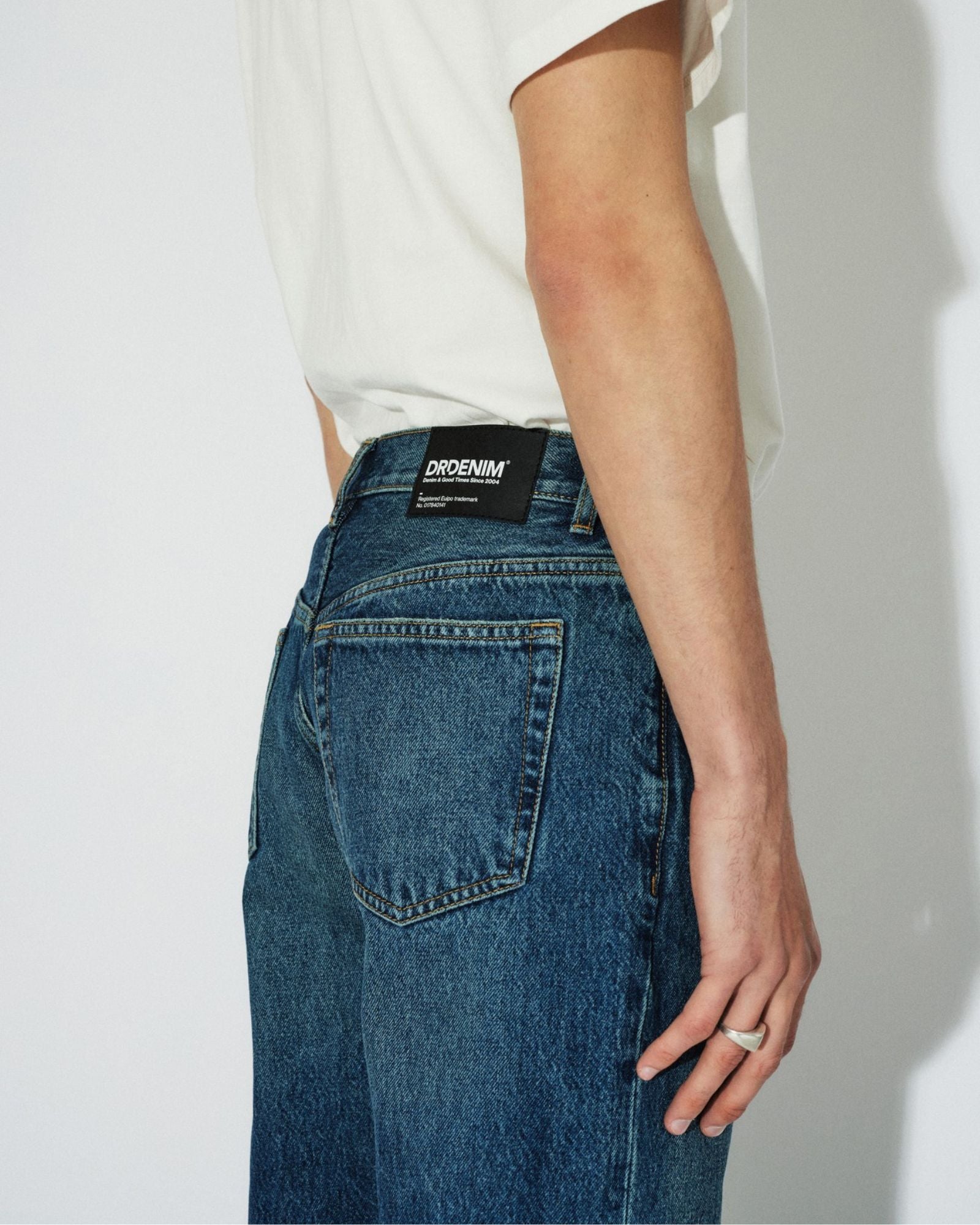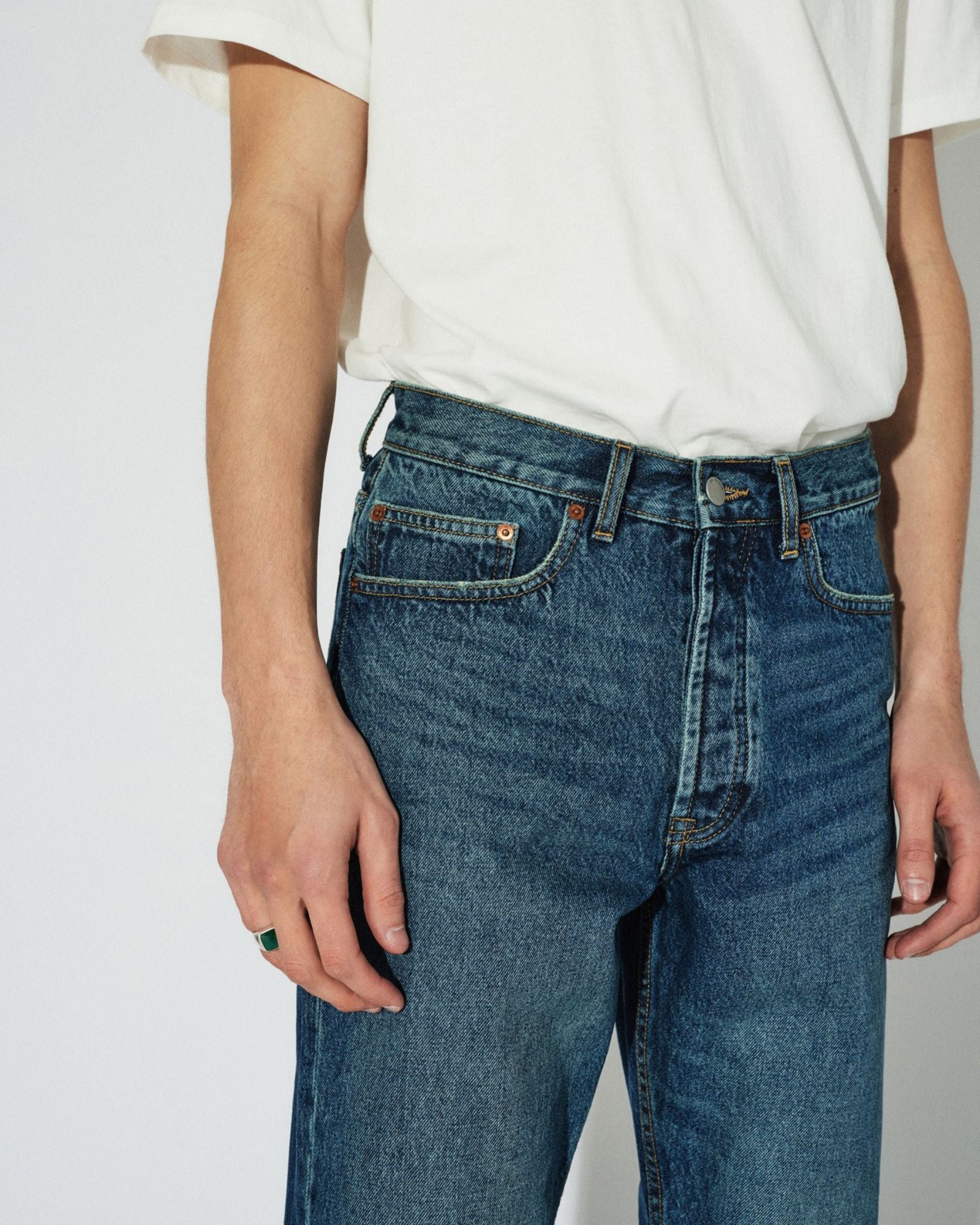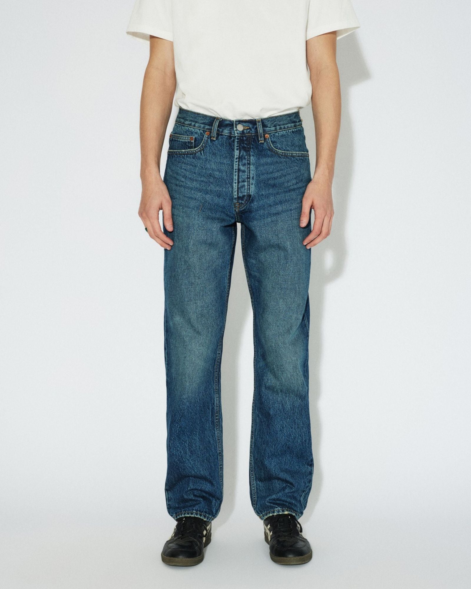 The Dash Straight Jeans in Stream Dark Fade Vintage. Crafted from recycled cotton for an eco-friendly design, these jeans feature a regular fit, mid waist, straight leg, anti-fit cut, button fly, and rigid denim fabric. Enjoy a classic denim look with an environmentally friendly twist.