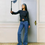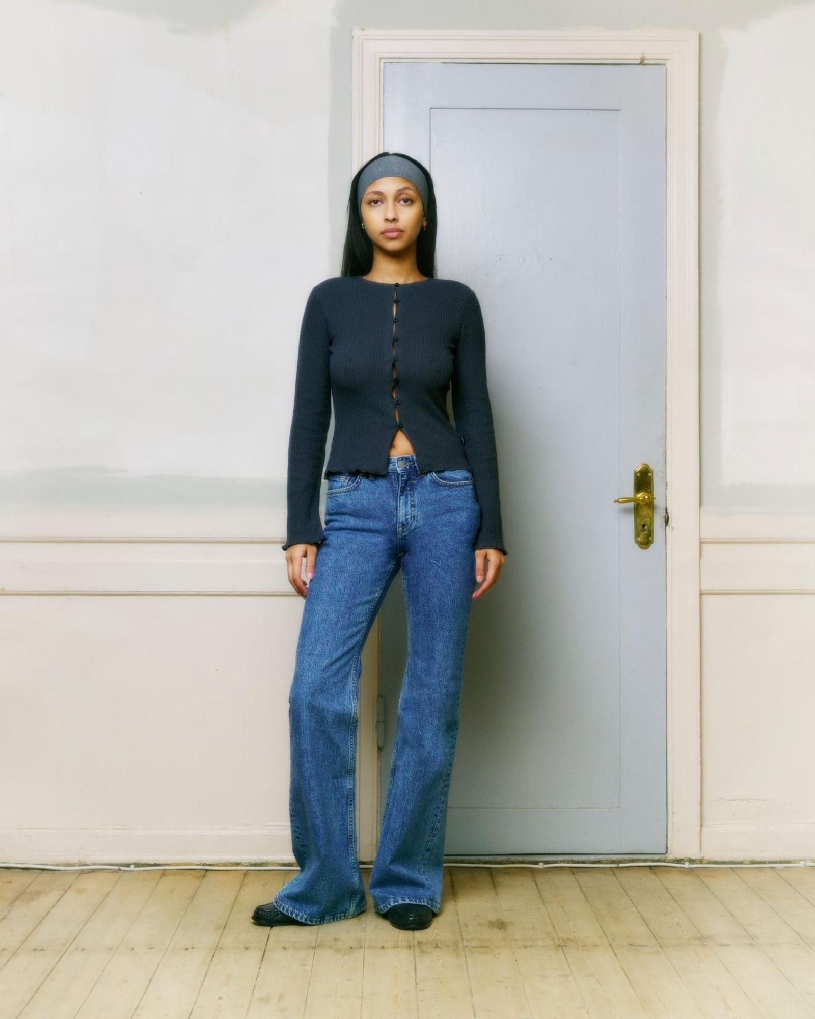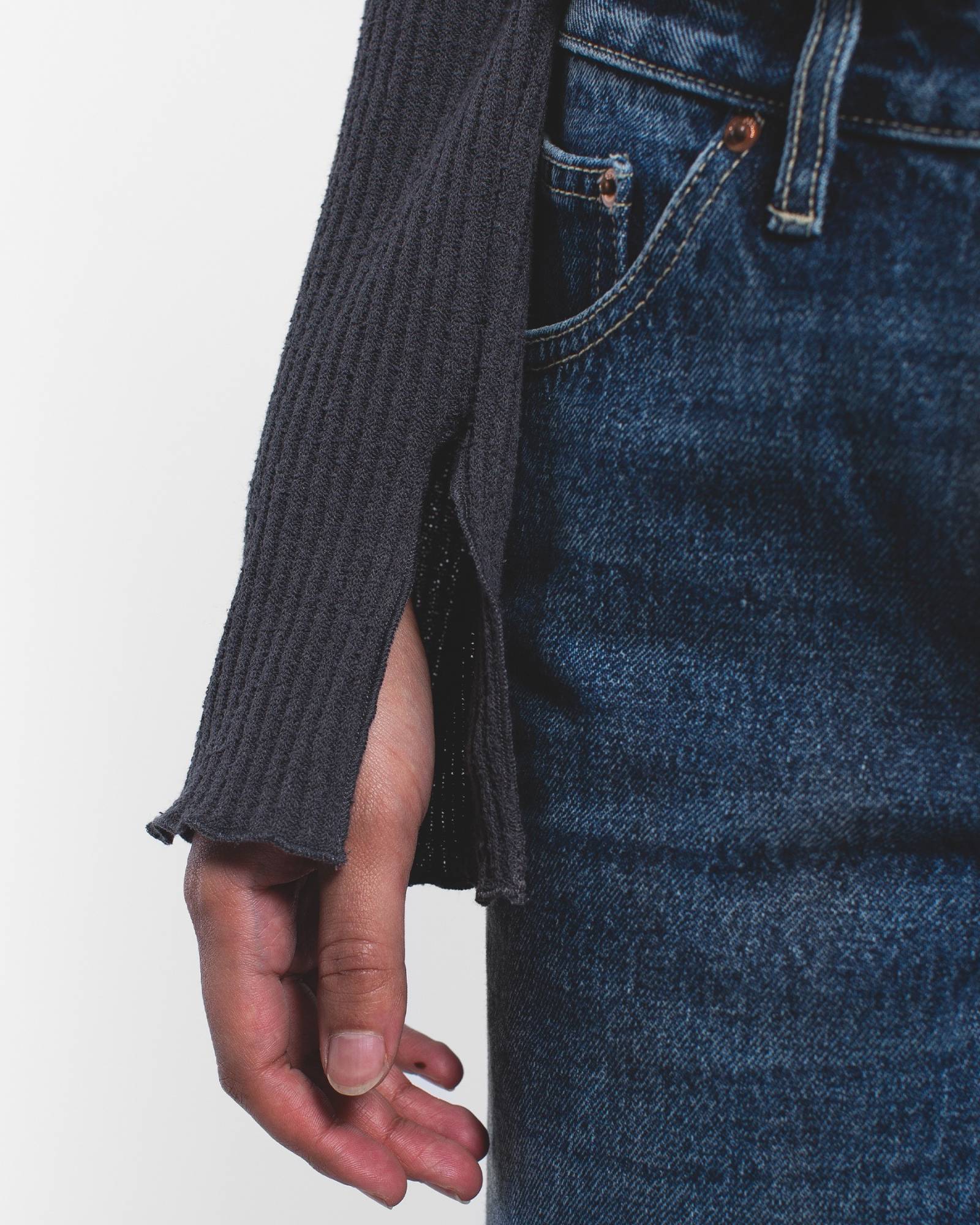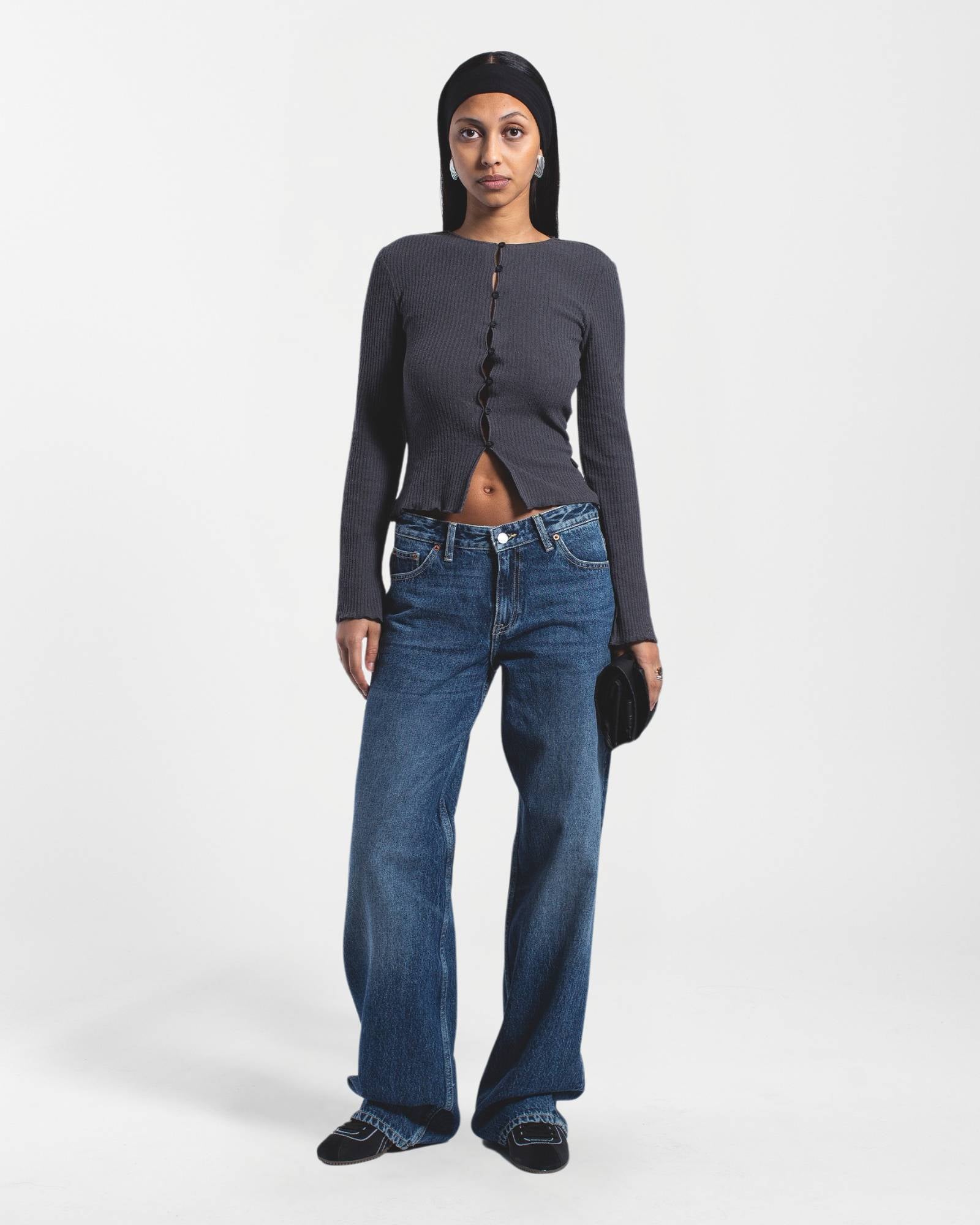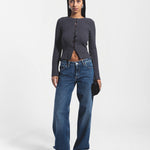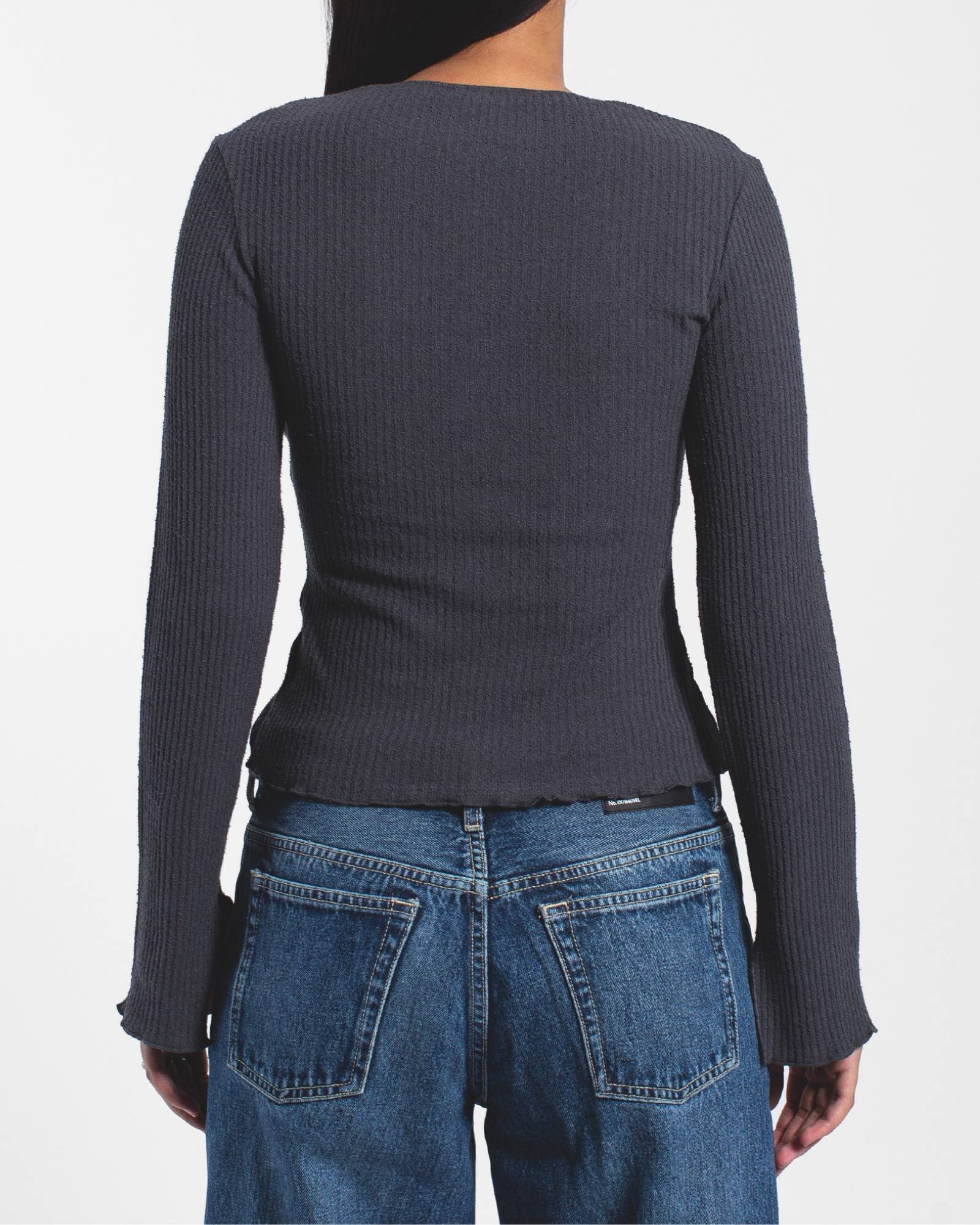 Shop the Erica Long Sleeve Rib Top in Asphalt Grey. A structured rib knit with button closure and flared sleeve detail - your go-to for the classic jeans-and-a-nice-top formula.