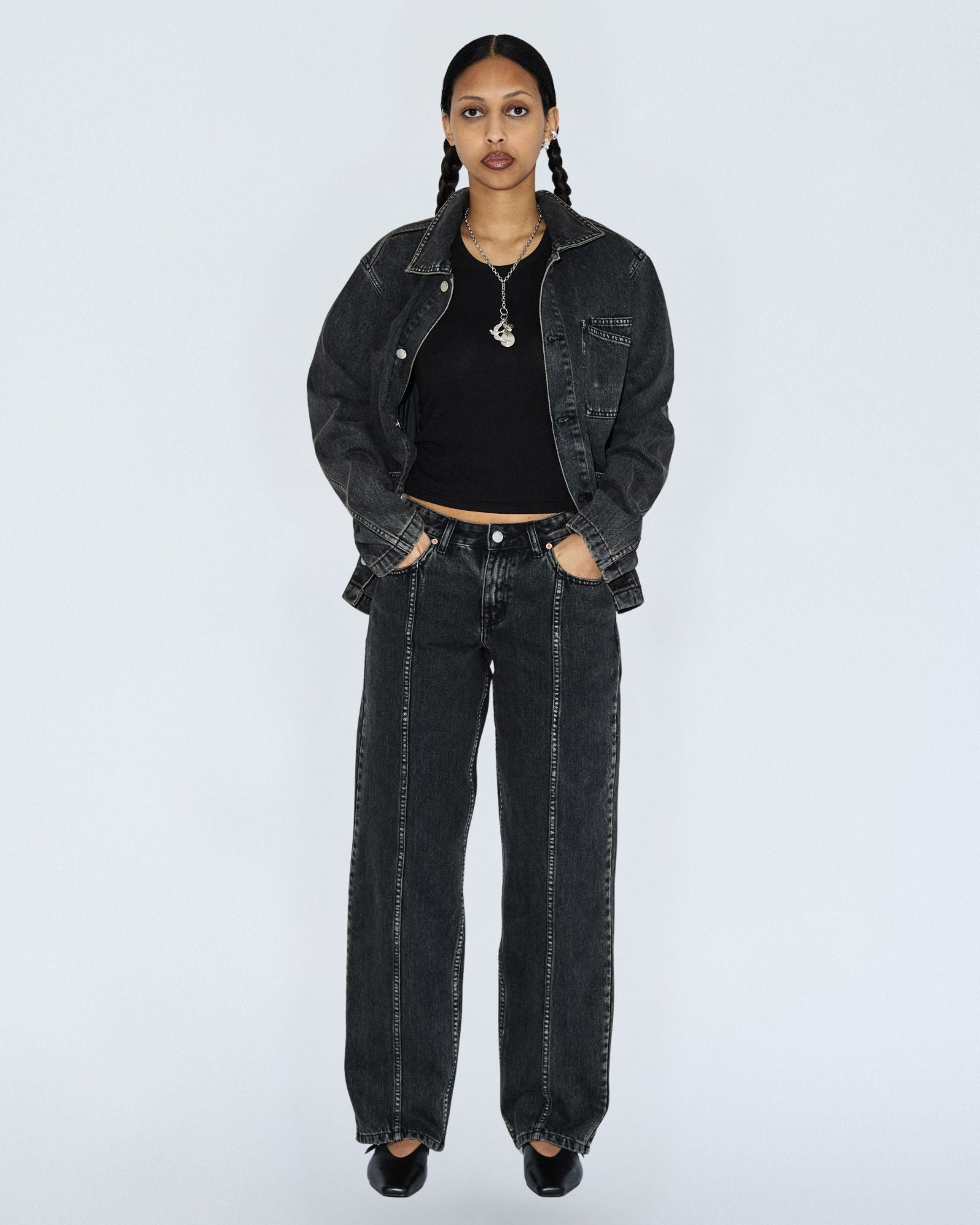 - Rigid (no stretch) denim fabric