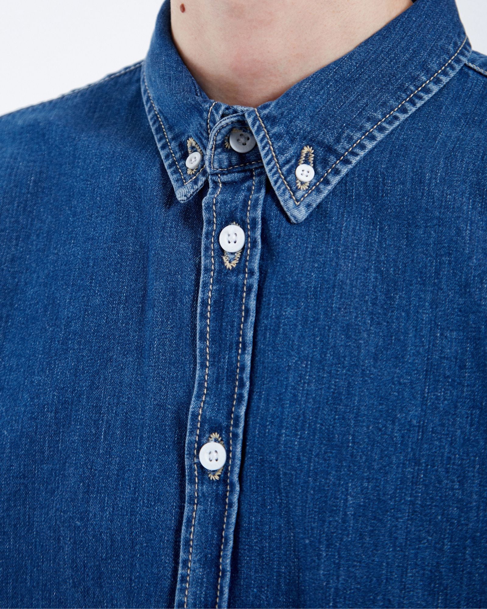 The Ray Shirt in Mid Retro is a unisex denim button-down, relaxed in fit and finished with a classic collar.
